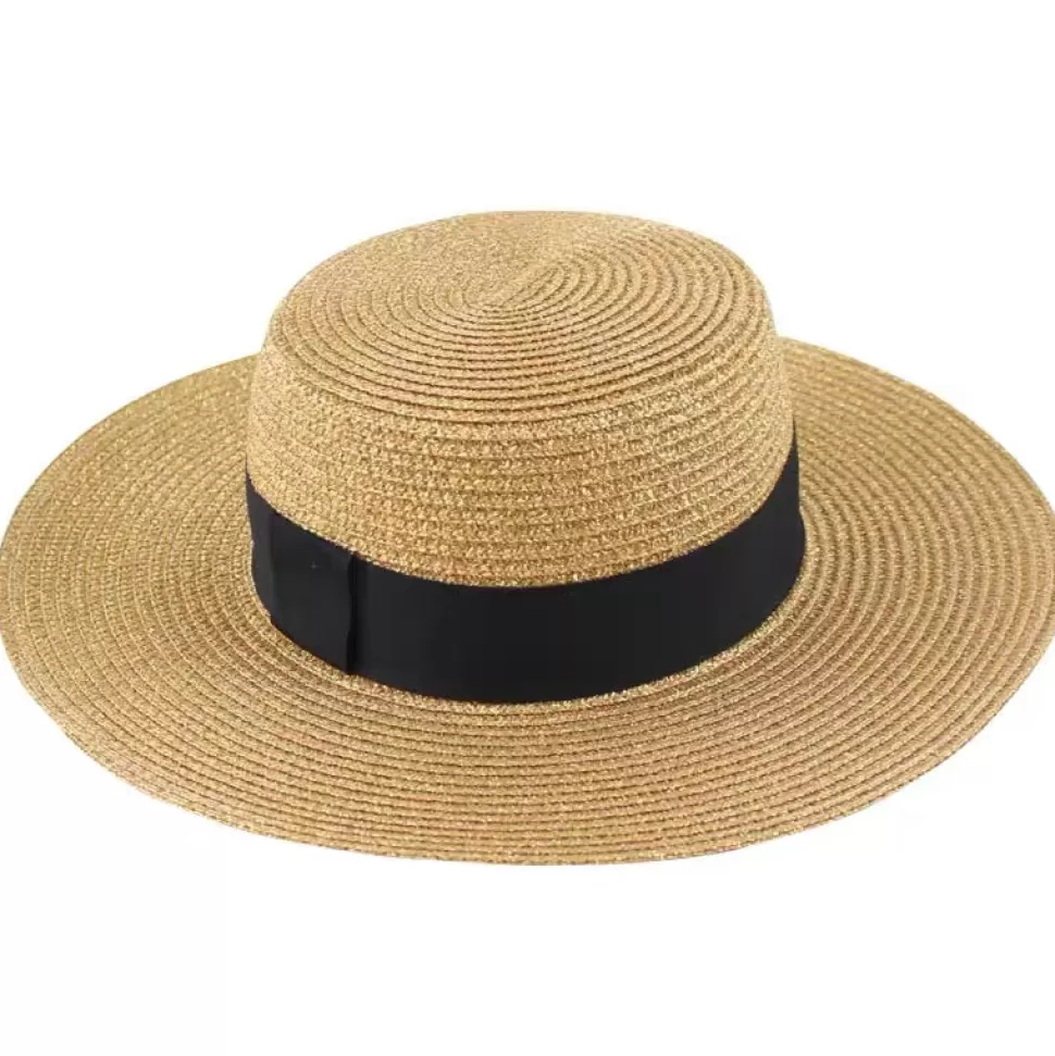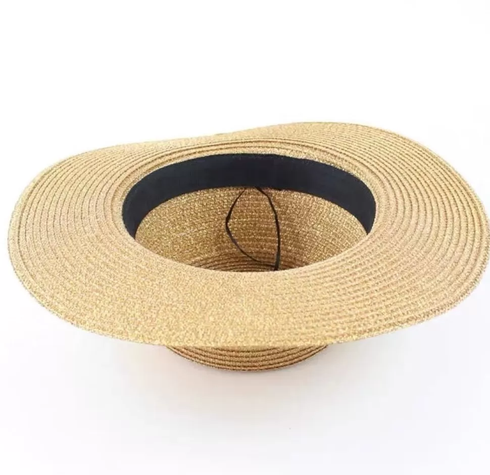 Women’s Gold sparkles Straw Cloche Hat With black ribbon String for size adjustment