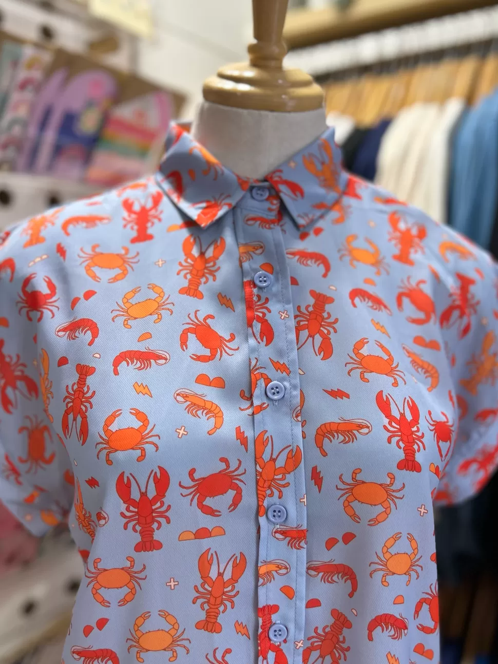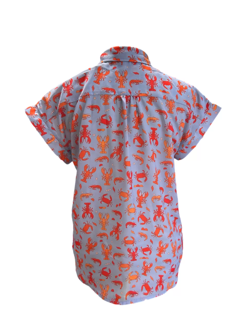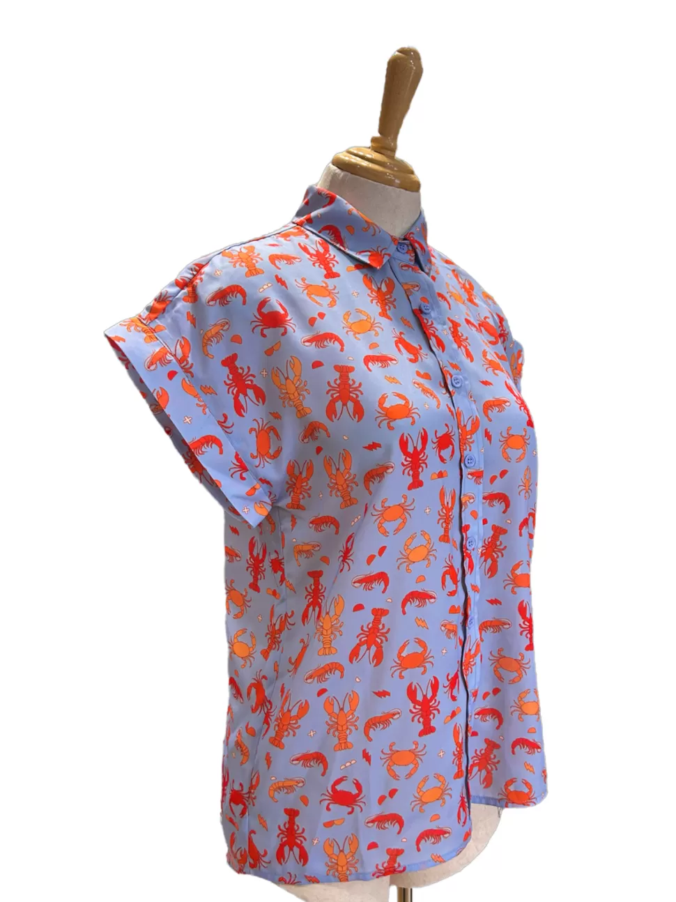 This is our most popular top, featuring a high collar, button-up front, and hemmed sleeves. 100% recycled polyester.