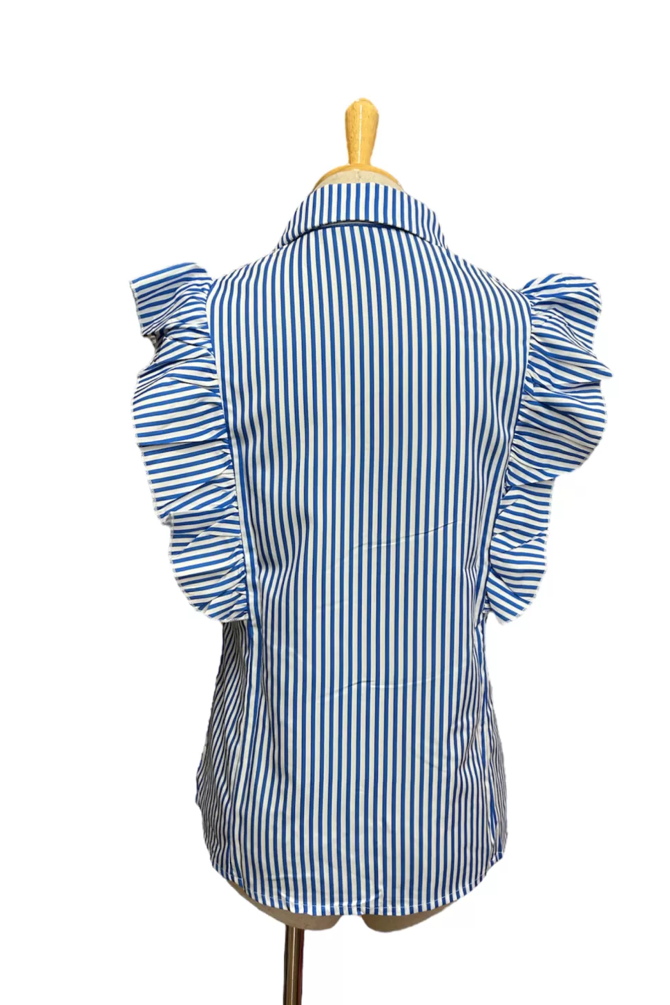 An adorable women’s top that boasts a lapel neckline, charming ruffled sleeves, and a delightful button-down style, all graced with a playful stripe print.