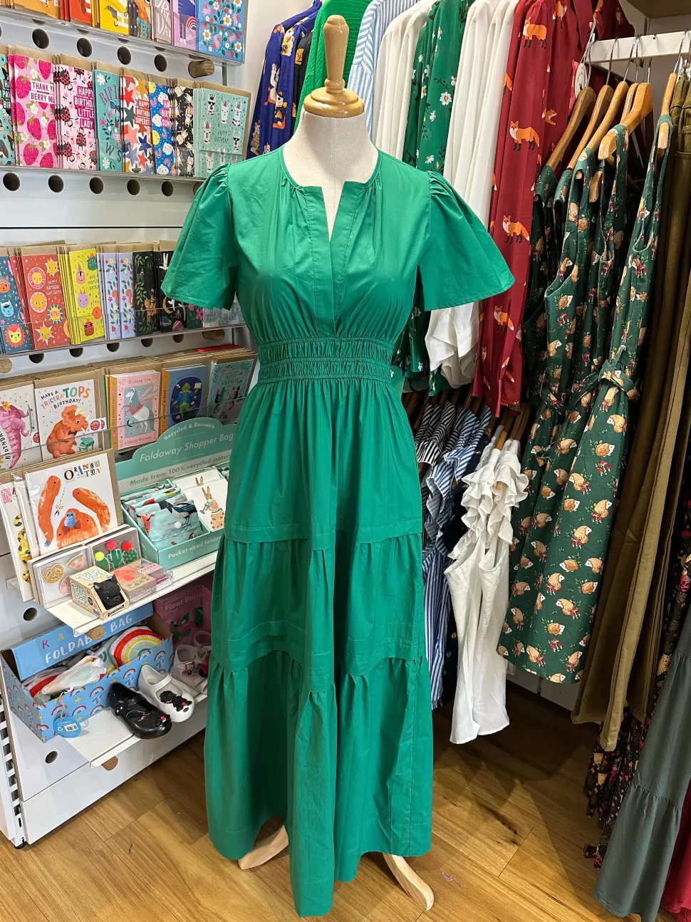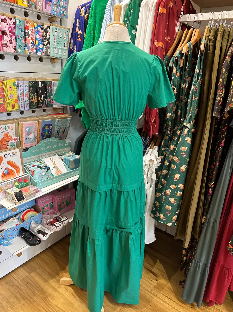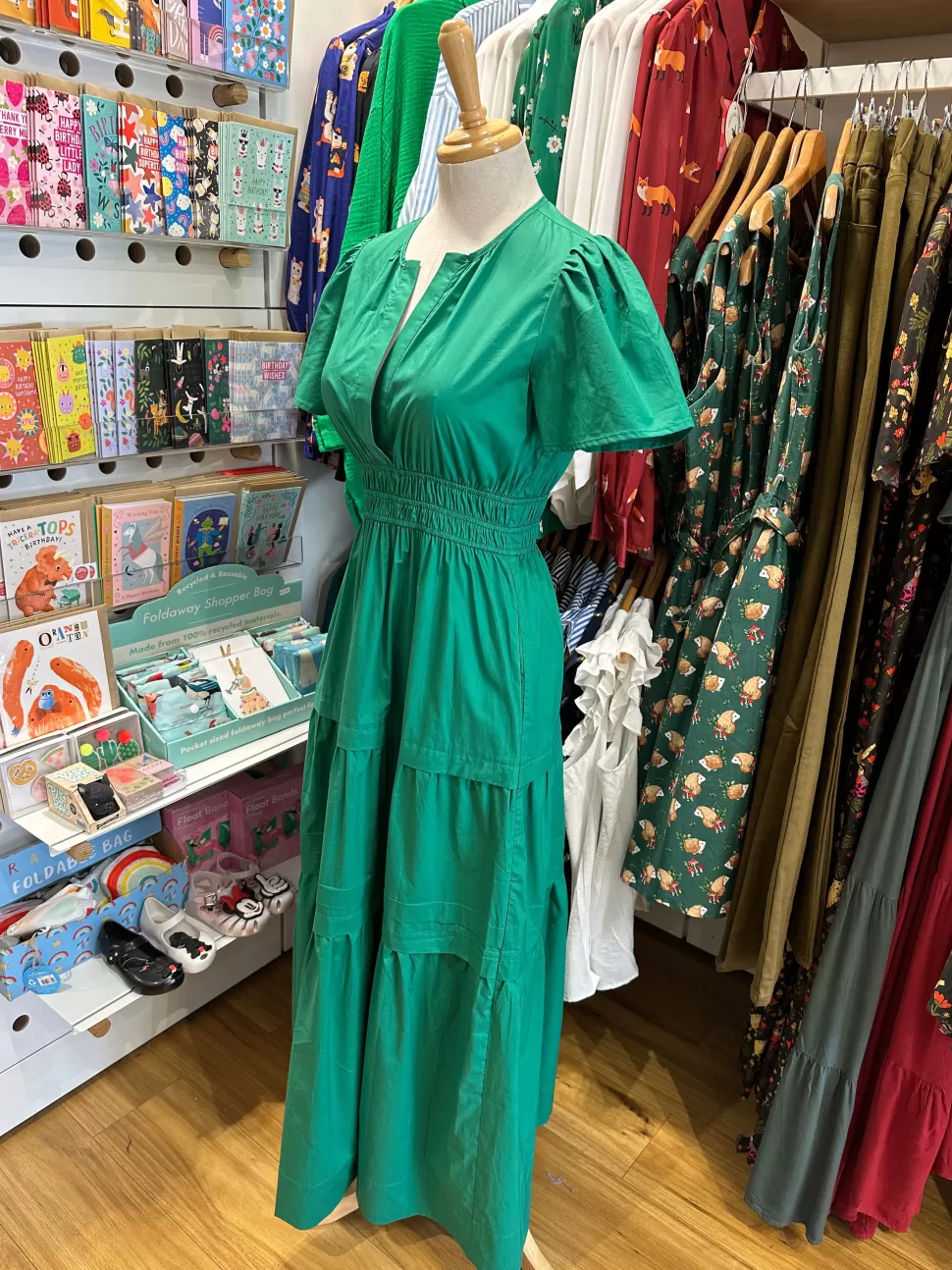 The Hanna maxi smock dress comes in vibrant green and blue solid cotton colors, adding a pop of color to your wardrobe. Crafted from lightweight cotton fabric, it features a flattering v-neckline, short sleeves with a gathered hem on the shoulders, and an elastic gathered waist for a comfortable fit. With the addition of two side pockets, this dress combines practicality with style, making it perfect for summer and spring occasions.