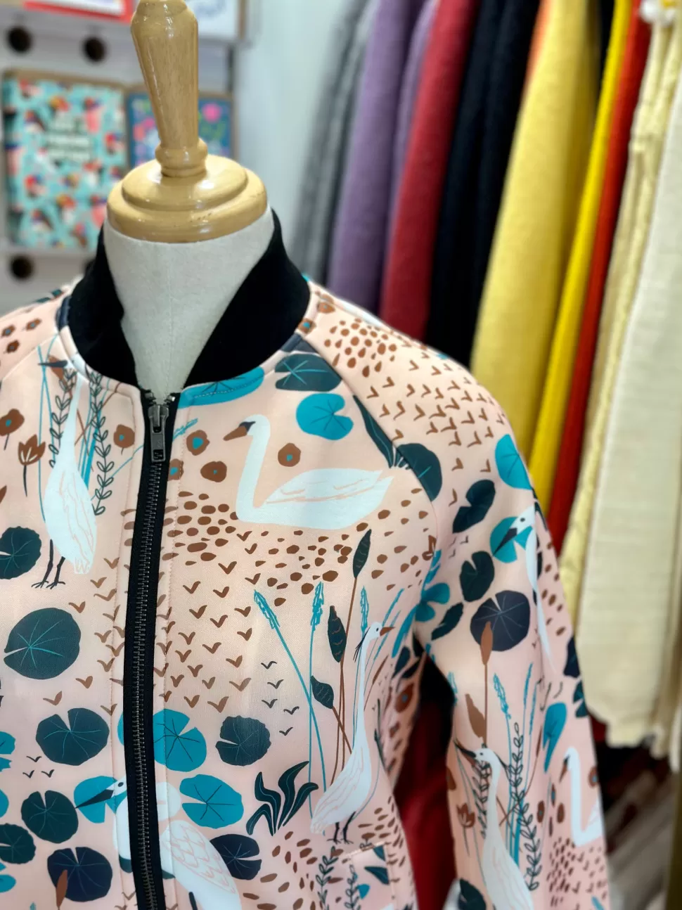 The Willow Bomber jacket showcases a captivating peach background swan print on lightweight, air layer fabrics, crafted …
