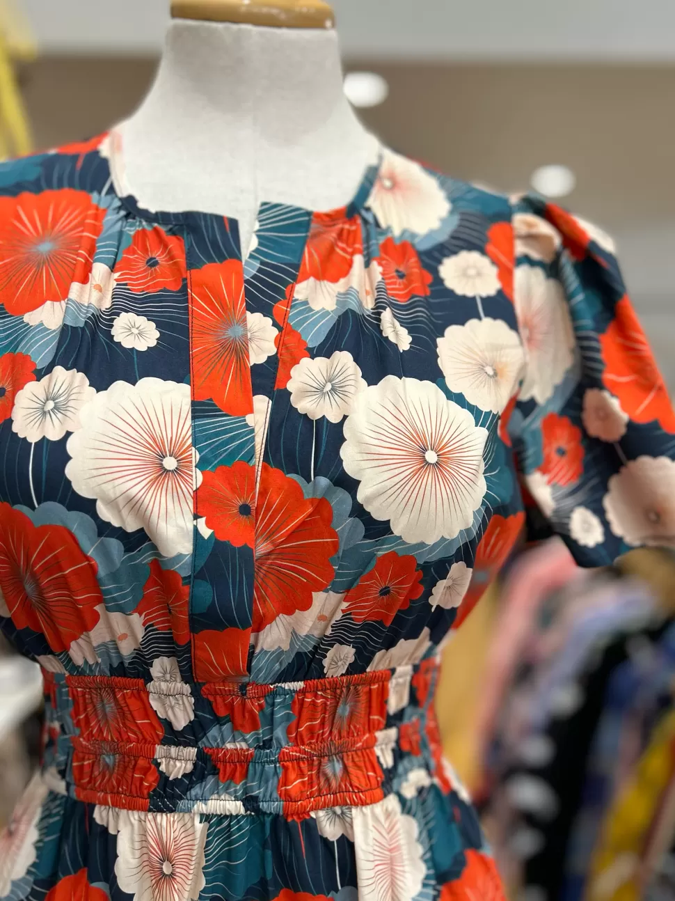 The Hanna maxi smock dress comes in colourful kimono print, adding a pop of colour to your wardrobe. Crafted from lightweight cotton fabric, it features a flattering v-neckline, short sleeves with a gathered hem on the shoulders, and an elastic gathered waist for a comfortable fit. With the addition of two side pockets, this dress combines practicality with style, making it perfect for summer and spring occasions.