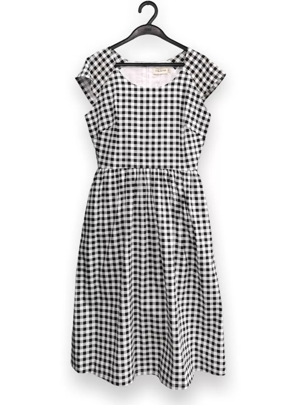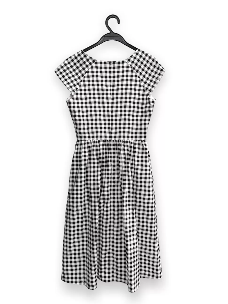 Introducing the “Life is Picnic” dress, now extended in length and sizing for the classic version. For a flattering fit, switch to size 6 if you were previously size 8. The timeless black and white gingham dress, made of 100% lightweight cotton, combines elegance with practicality. Featuring a back zipper and pockets, it’s your ideal companion for carefree outings, seamlessly blending comfort and sophistication.