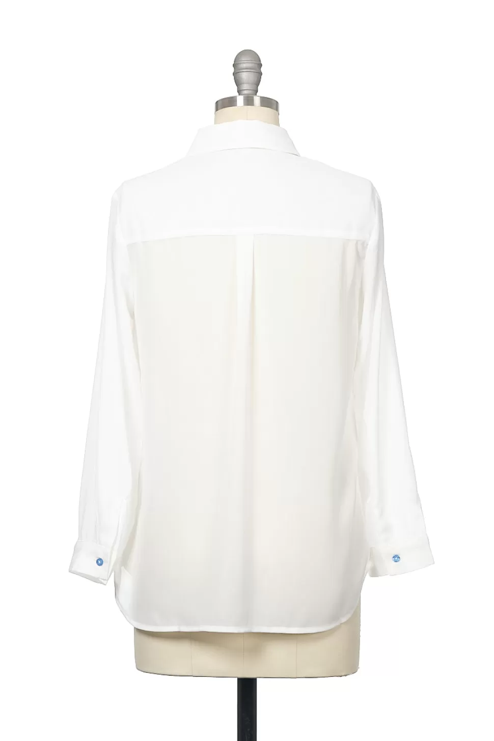 This 100% polyester blouse features baby blue buttons and full length sleeves. Peeking out of the breast pocket is a swe…