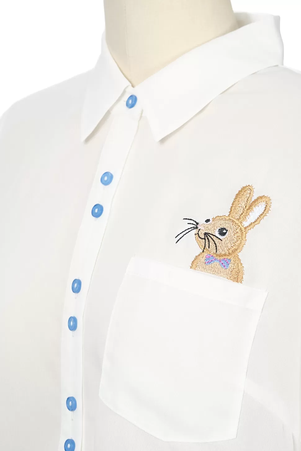 This 100% polyester blouse features baby blue buttons and full length sleeves. Peeking out of the breast pocket is a sweet little rabbit to accompany you on your journeys!