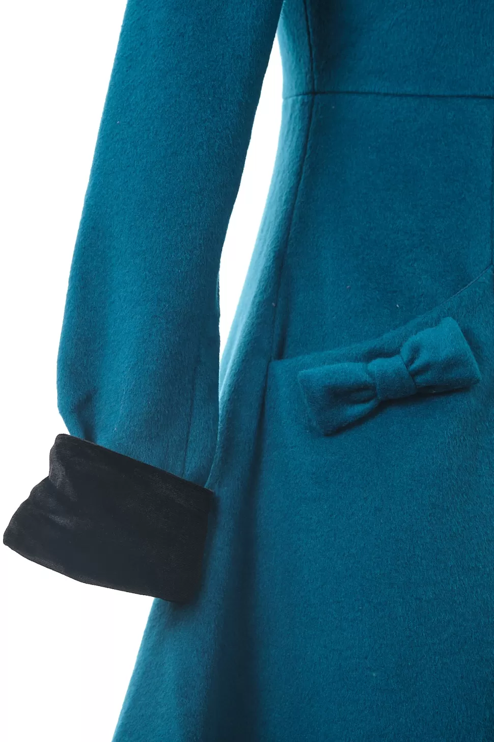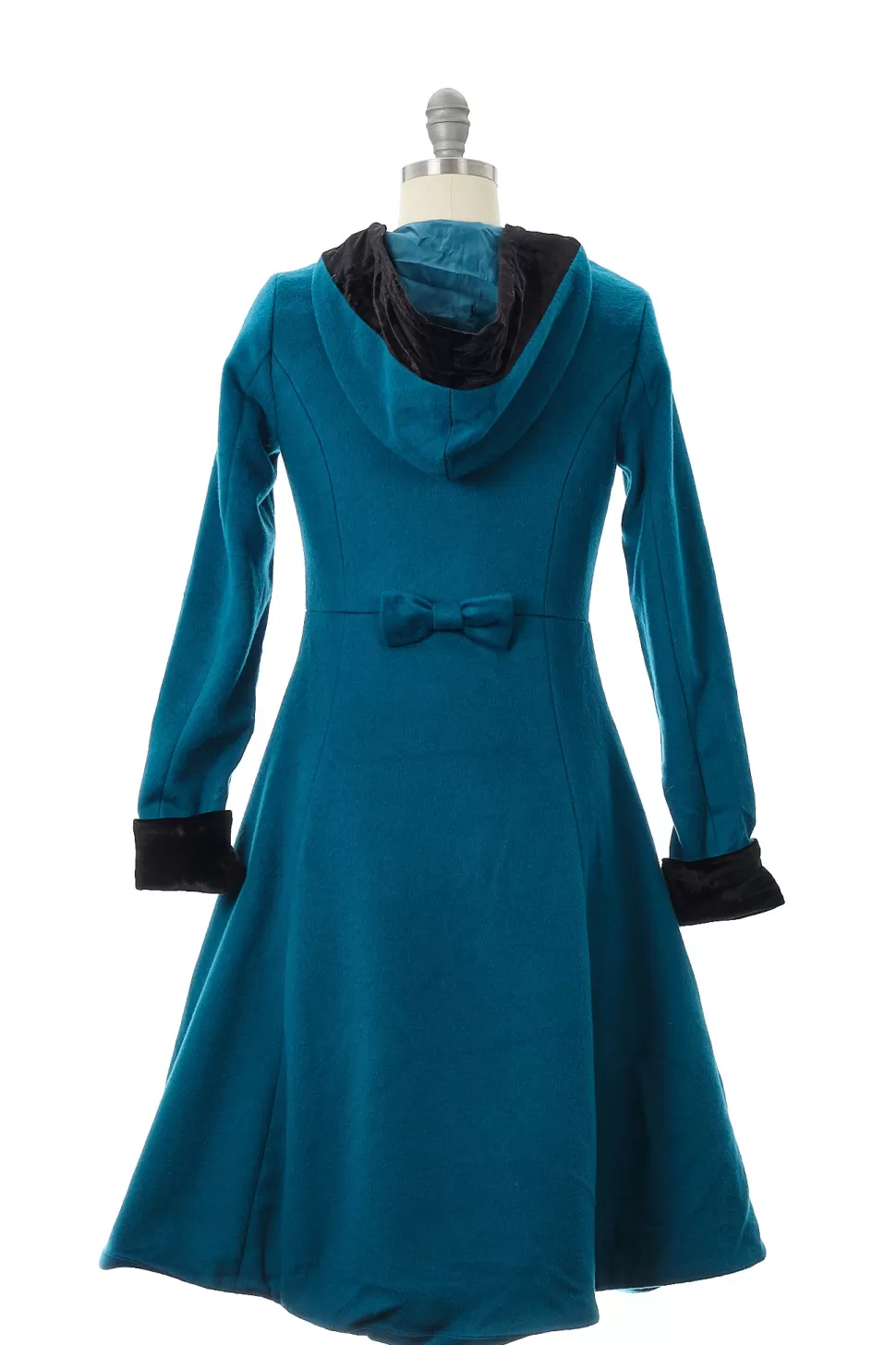 This coat is thick and fully lined, featuring sweet bow details on the pockets, cuffed sleeves, and a beautiful black hood. This coat is so darling it even features a sweet bow detail at the back!