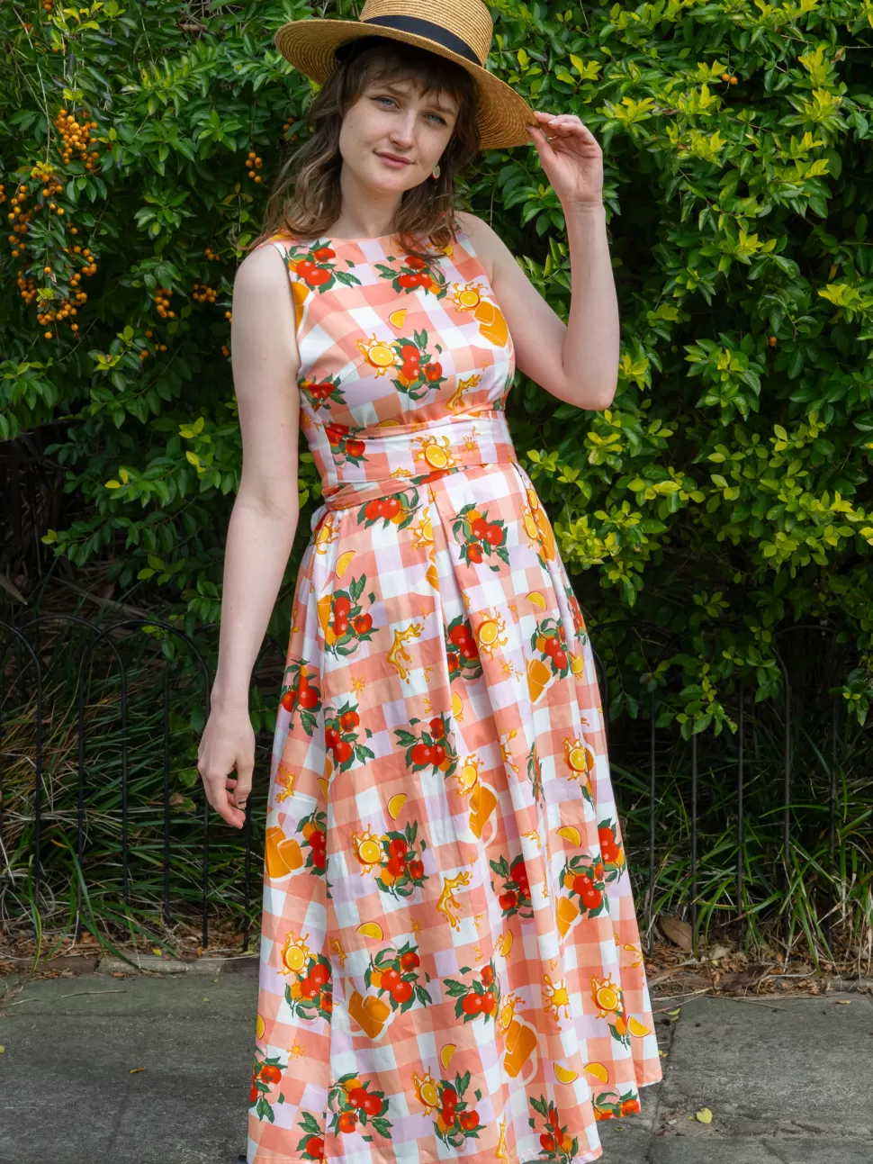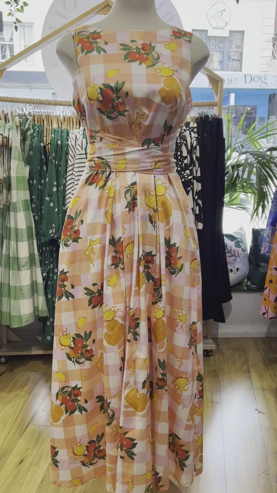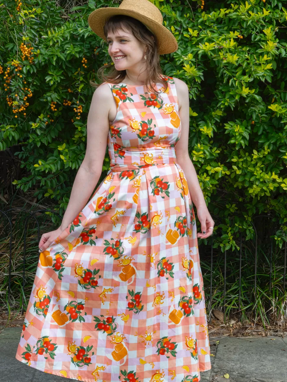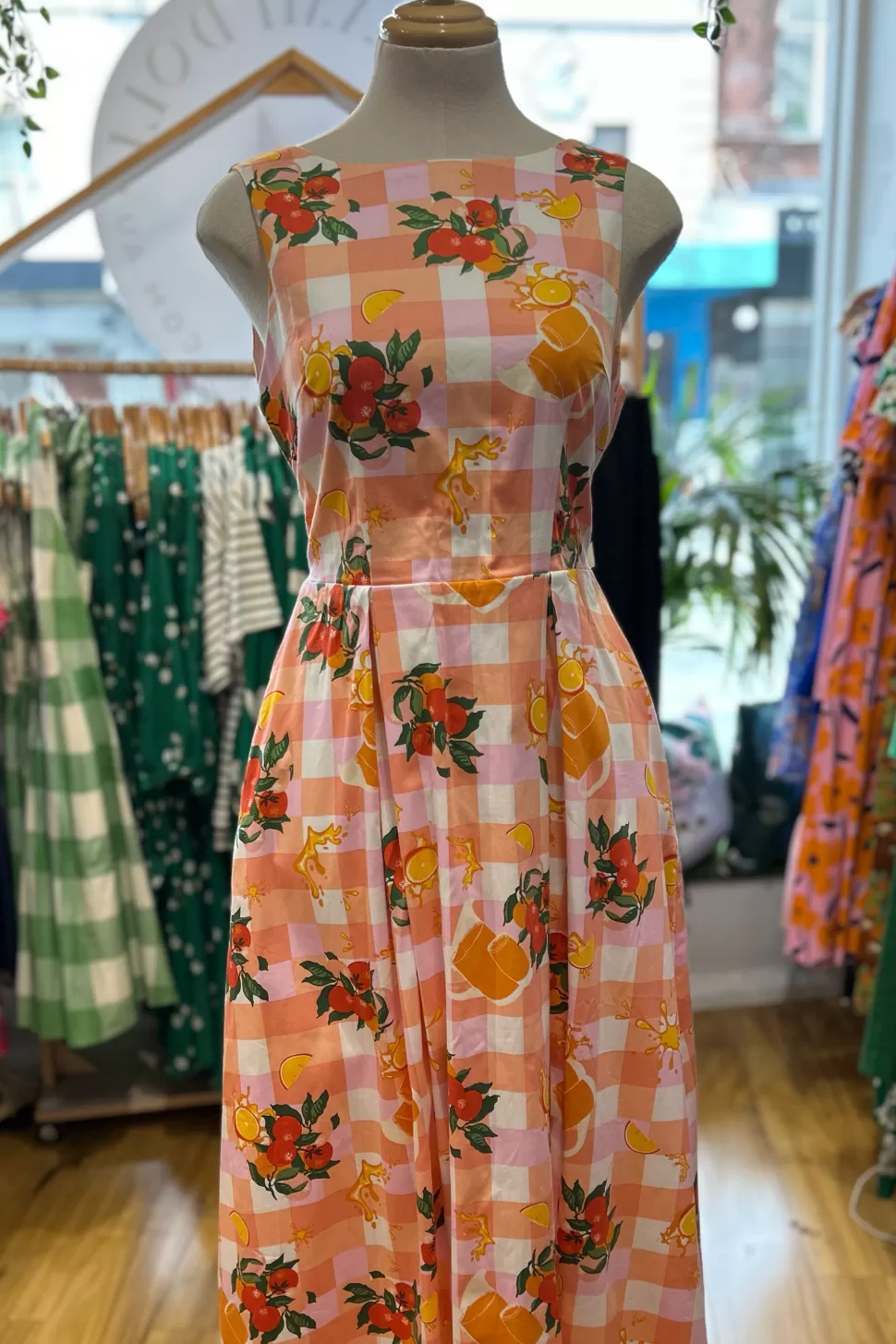 Picture a stunning plaid background cotton dress that features a wide sash belt tied elegantly at the back. This midi-length dress boasts a beautiful combination of vibrant orange and soft pink colors, creating a harmonious and eye-catching blend. The dress is not only aesthetically pleasing but also comfortable, thanks to its full cotton lining that ensures a cozy fit. Whether you’re enjoying a sunny day outdoors or attending a special event, this dress is the perfect choice to exude a sense of style and sophistication while embracing the refreshing and invigorating vibe of orange and orange juice.
