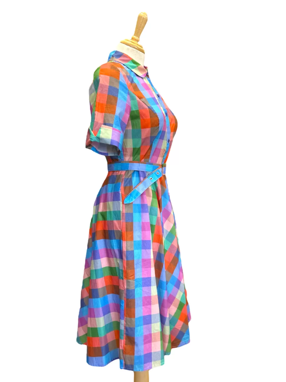 Audrey is a vintage-inspired shirt dress that features romantic rainbow checkered print. She has button up front and half sleeves with turn-up cuffs. Her full swing skirt is hemmed approximately below the knee. She has side seam pockets that are perfect for those essentials, and includes a matching belt for a cinched in waist effect. 100% Cotton