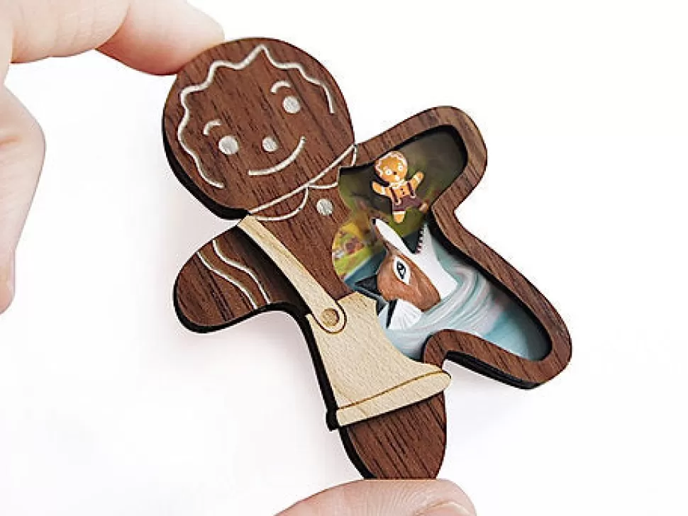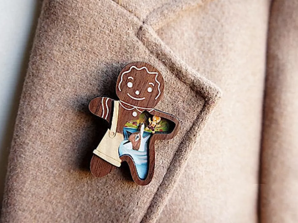 Necklace inspired by the gingerbread man, an English children’s story. Contains a paper miniature of the scene where the cookie man is going to be eaten by the cunning fox. The layout of the paper creates a successful effect of depth. All this inside an attractive natural wood frame in the shape of the gingerbread man himself.